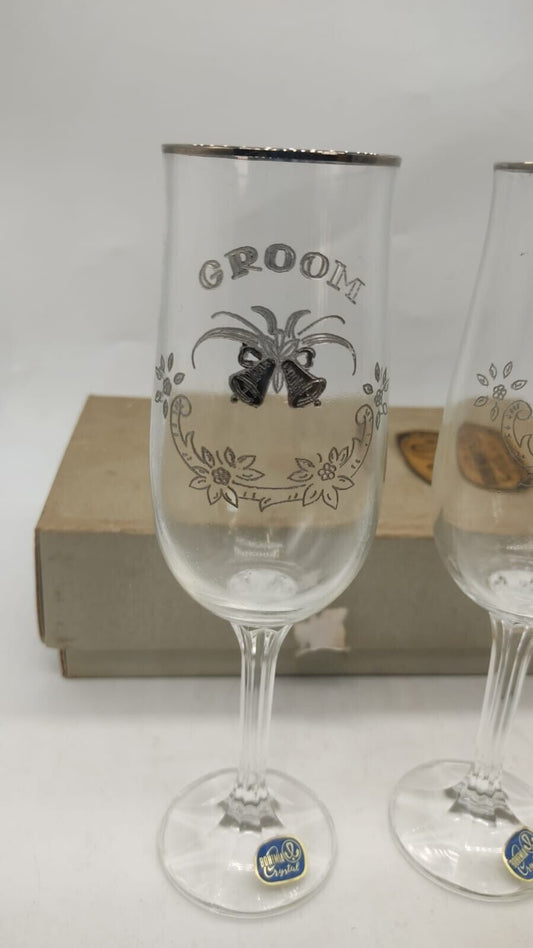 Vintage Bohemia Crystal Glasses Bride & Groom Print Wedding Gift. Boxed
