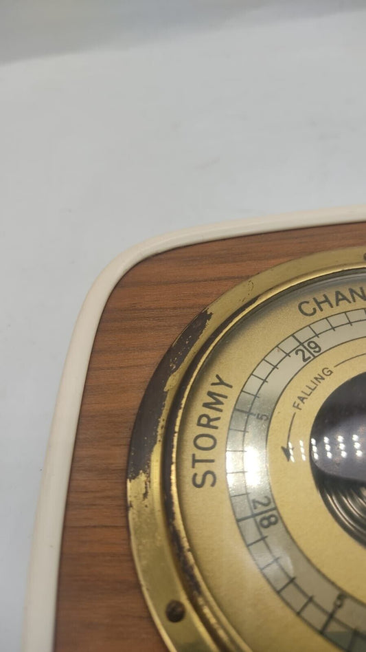 Vintage Weather Station Barometer Thermometer Brass Wood