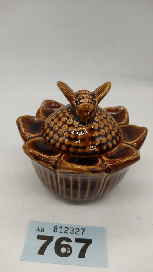 Brown Preserve Honey Jam Pot Flower Design Bumblebee Lidded Pot, 1960's, Vintage