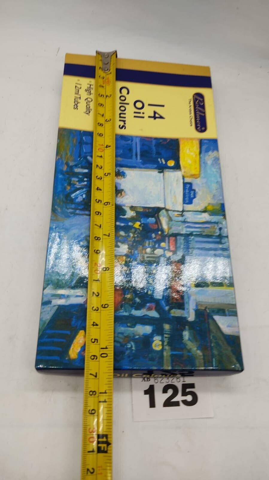 While the outer packaging may bear some staining, the tubes themselves are securely sealed, ensuring the integrity and freshness of the oil colors. Delve into the accompanying pictures for detailed measurements, offering you a comprehensive view of the size and condition of this artful collection.
