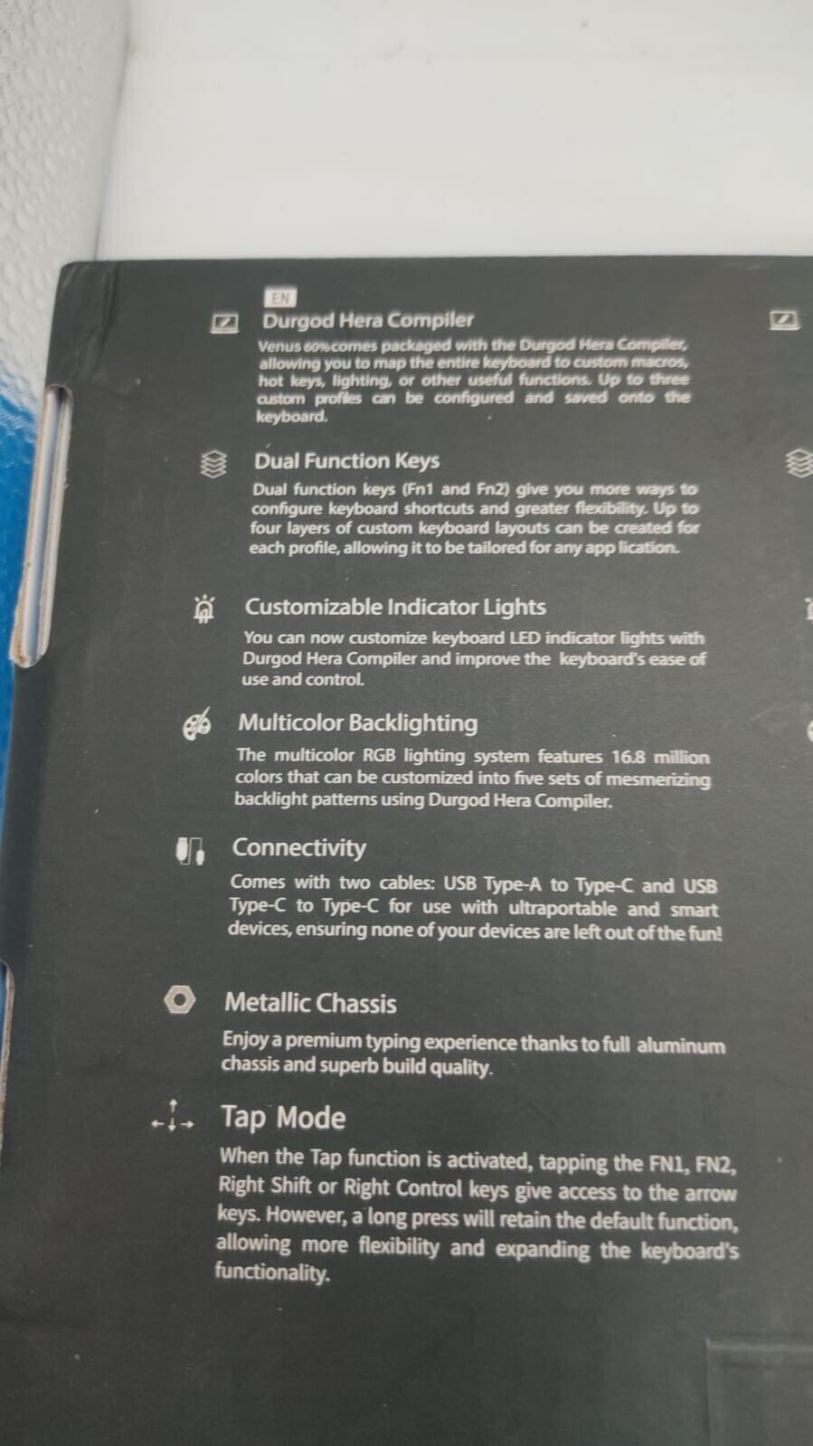 Elevate your typing experience with the Durgod Venus Compiler Mechanical Keyboard – a sophisticated and high-performance input device designed for discerning users. In a new sealed condition, this keyboard stands ready to bring a seamless blend of precision, style, and customizable RGB lighting to your desktop setup. The Compiler keyboard offers a perfect balance between functionality and space-saving design. Equipped with high-quality mechanical switches, every keystroke delivers tactile feedback and responsiveness, making it an ideal choice for both work and gaming enthusiasts. The customizable RGB lighting with 16.8 million color options allows you to personalize your keyboard to match your style and mood. Featuring a USB 3.0 port, this keyboard not only ensures fast and reliable data transfer but also provides a convenient hub for connecting your other USB devices. The new sealed condition guarantees that you receive a keyboard with all its features intact, ready to be unboxed and integrated into your workspace. For detailed specifications and sizing information, refer to the images provided, allowing you to envision the perfect placement for this mechanical keyboard in your setup. Unbox the future of efficient and stylish typing with the Durgod Compiler Mechanical Keyboard, where form meets function in a perfect fusion of performance and aesthetics.