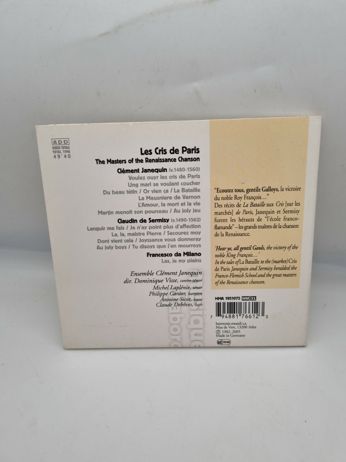 Les Cris De Paris By Janequin Chansons Harmonia Mundi Visse Livre Music Audio CD.